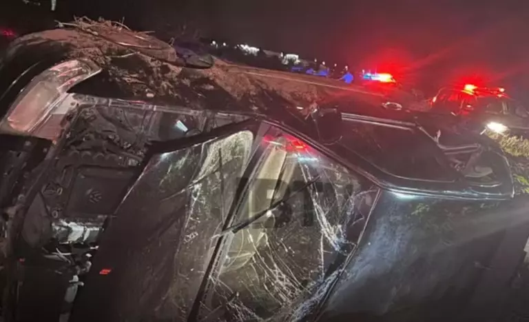 Conforme os bombeiros, o motorista bateu o carro contra uma placa de sinalização e capotou em seguida. Ele ficou preso às ferragens e, por conta disso, as autoridades precisaram serrar parte do veículo para conseguir tirá-lo.